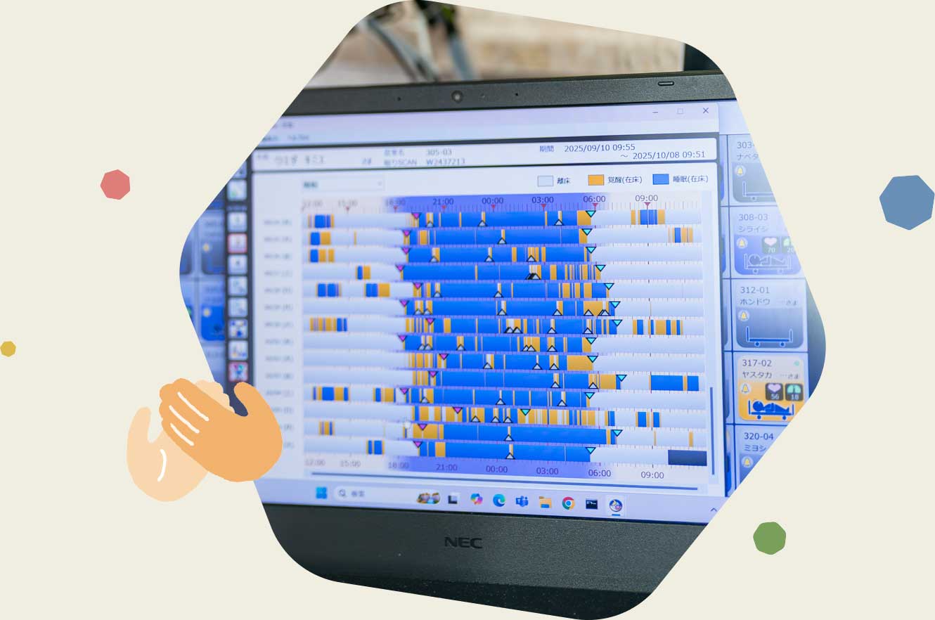 令和4年度に導入した「眠りSCAN」により、睡眠・覚醒・起き上がり・離床・心拍数・呼吸数などを、離れた場所からでもリアルタイムに把握することができるようになりました。タブレット・スマートフォン、インカムとの連動により、転倒事故のリスクの低減や、利用者さまの状態に応じた見回りや適切な対応が可能になりました。また、睡眠状況や生活習慣のデータ化が容易になり、ケアプラン作成に活用することもできます。