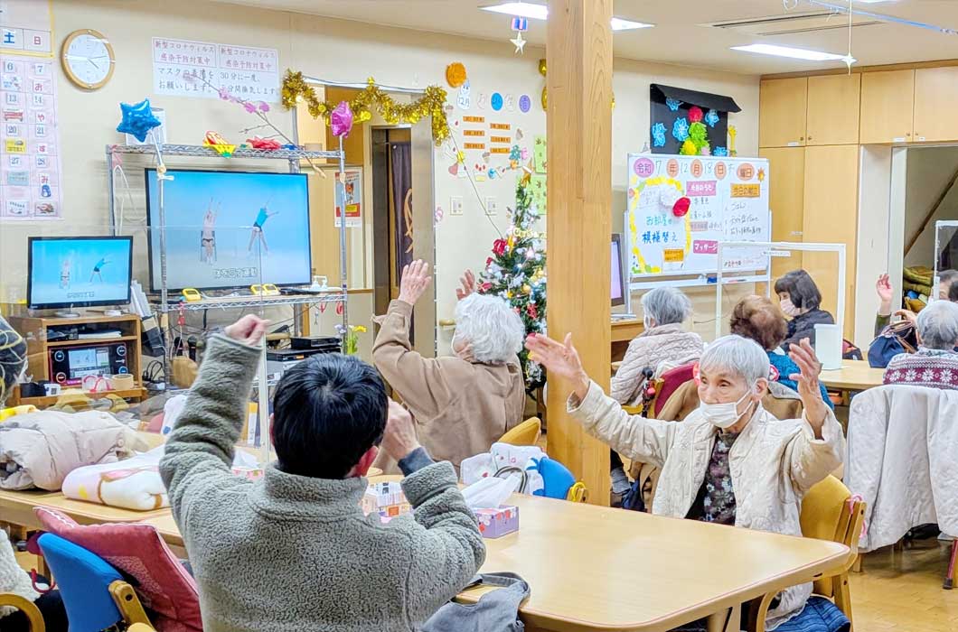 皆さんで一緒に「今月の歌」を歌ったり、座ったままでできる体操を行い身体をほぐします。(※健康チェックが終わった方から随時入浴・機能訓練にご案内します。)